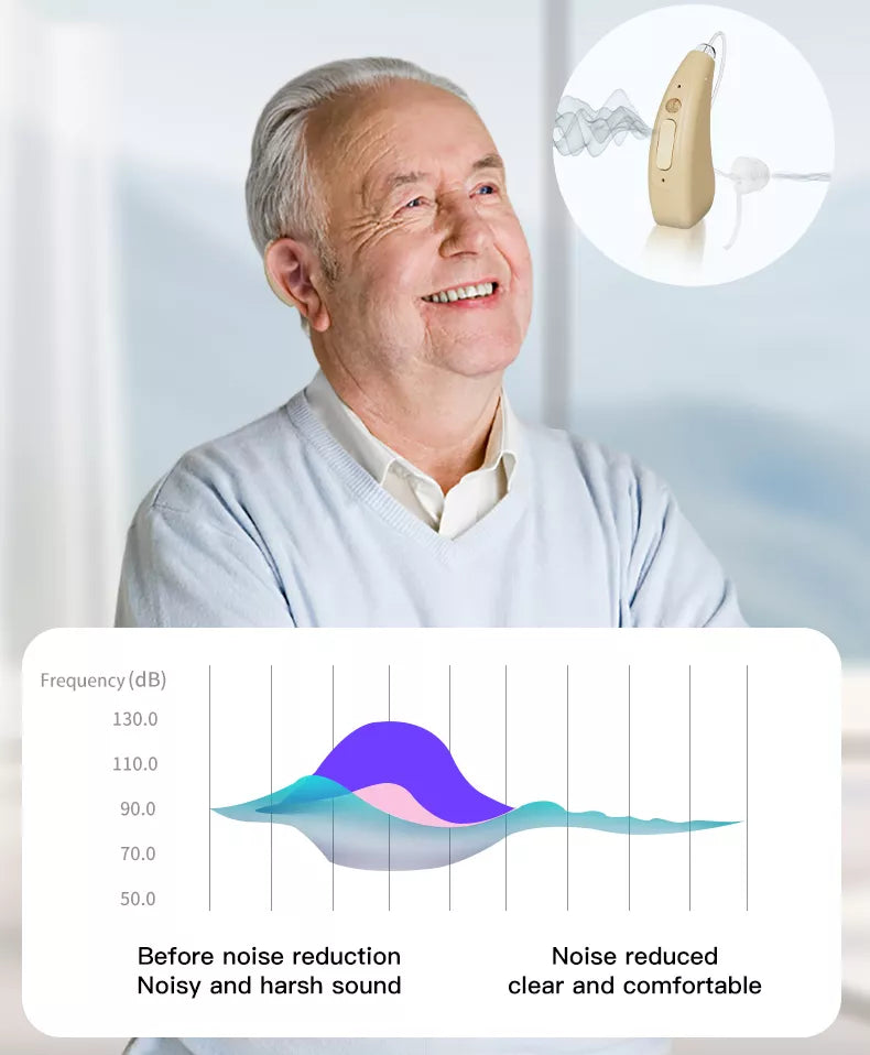Das Hörgerät ist mit einem fortschrittlichen Rauschunterdrückungschip ausgestattet, der externe Geräusche automatisch herausfiltert und so für eine klarere und realistischere Klangqualität sorgt.
