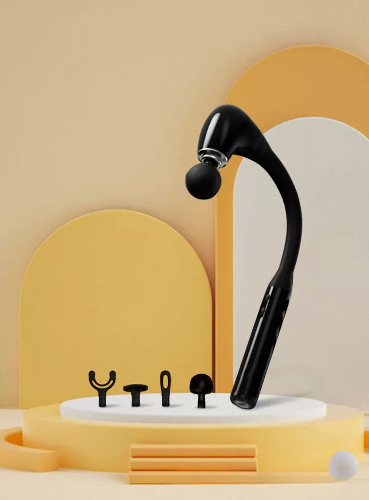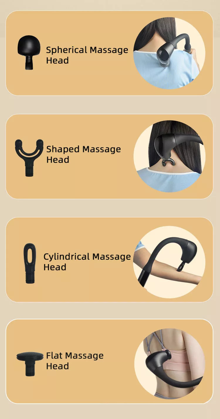 Our massager comes with four interchangeable heads: the ball-shaped head is perfect for general areas like arms and legs, the U-shaped head is ideal for neck and spine, the bullet head targets deep tissue and pressure points, and the flat head is best for large muscle groups like the back. Simply select the head that matches your massage needs.
